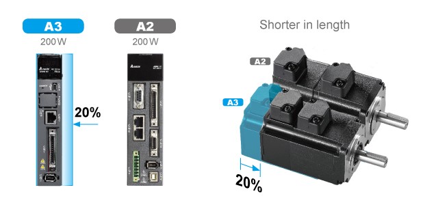 4/ Drive và motor dòng A3 có thiết kế nhỏ và ngắn hơn 20% so với dòng A2, giúp tiết kiệm không gian.