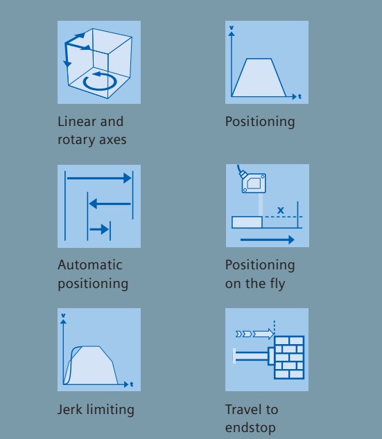 Ứng dụng điều khiển: Linear and rotary axes, Positioning, Automatic Positioning, Positoning on the fly, Jerk Limiting, Travel to end stop
